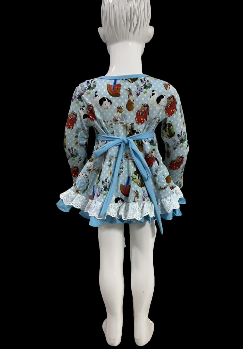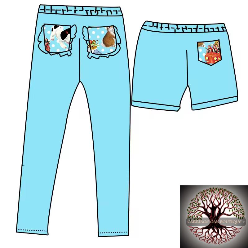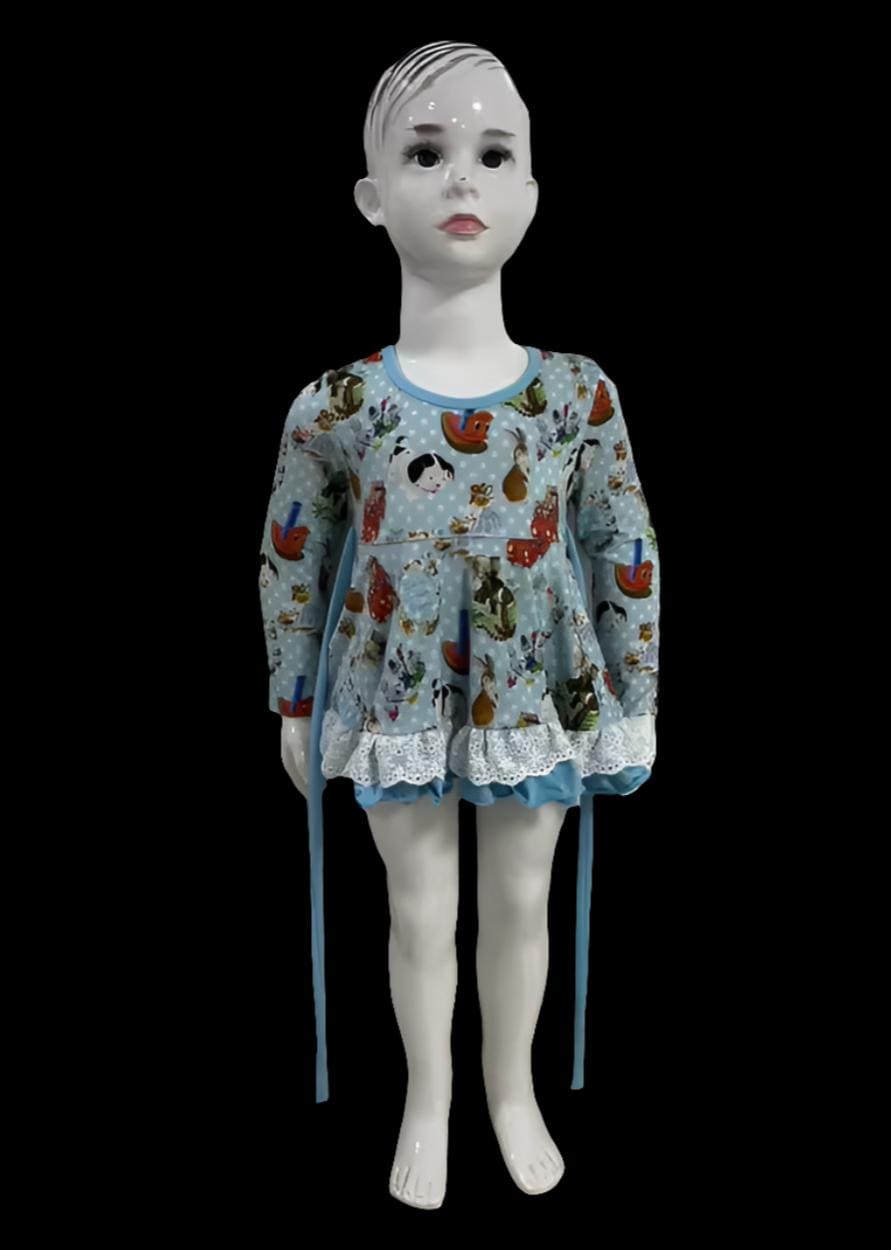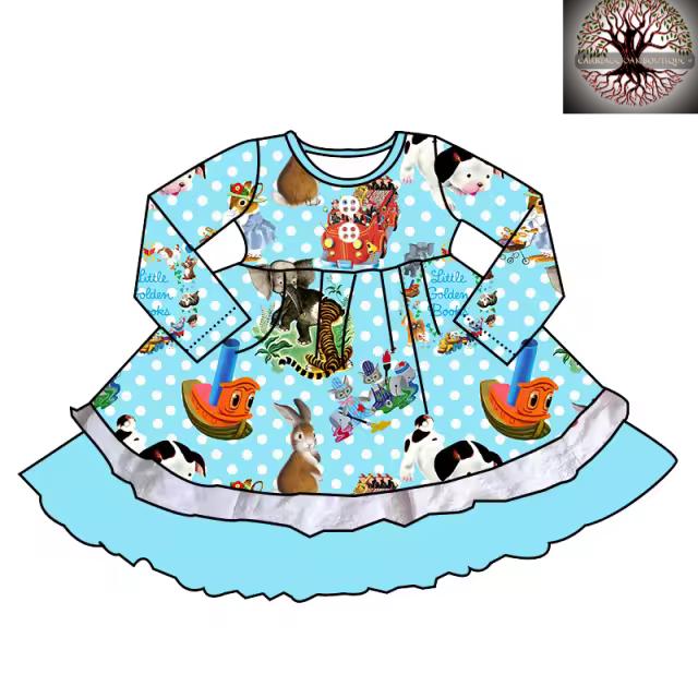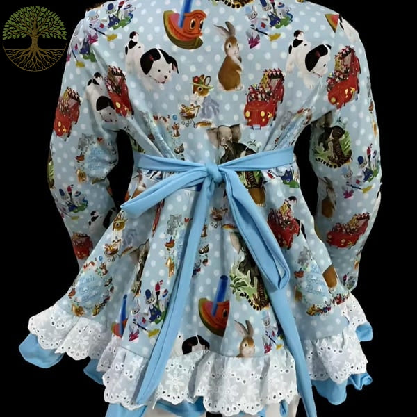 This charming long-sleeve dress features a playful blue background adorned with the whimsical “Little Golden Books” illustrations, complete with polka dot accents. The dress has a flared skirt with a light blue ruffled hem, making it a fun and cheerful choice for young children, perfect for playdates or casual outings. Accompanying the dress are matching leggings and shorts: the leggings feature two back pockets that coordinate with the dress's print, while the shorts come with one back pocket that also matches the delightful design. This set offers versatile styling options for any adventure!